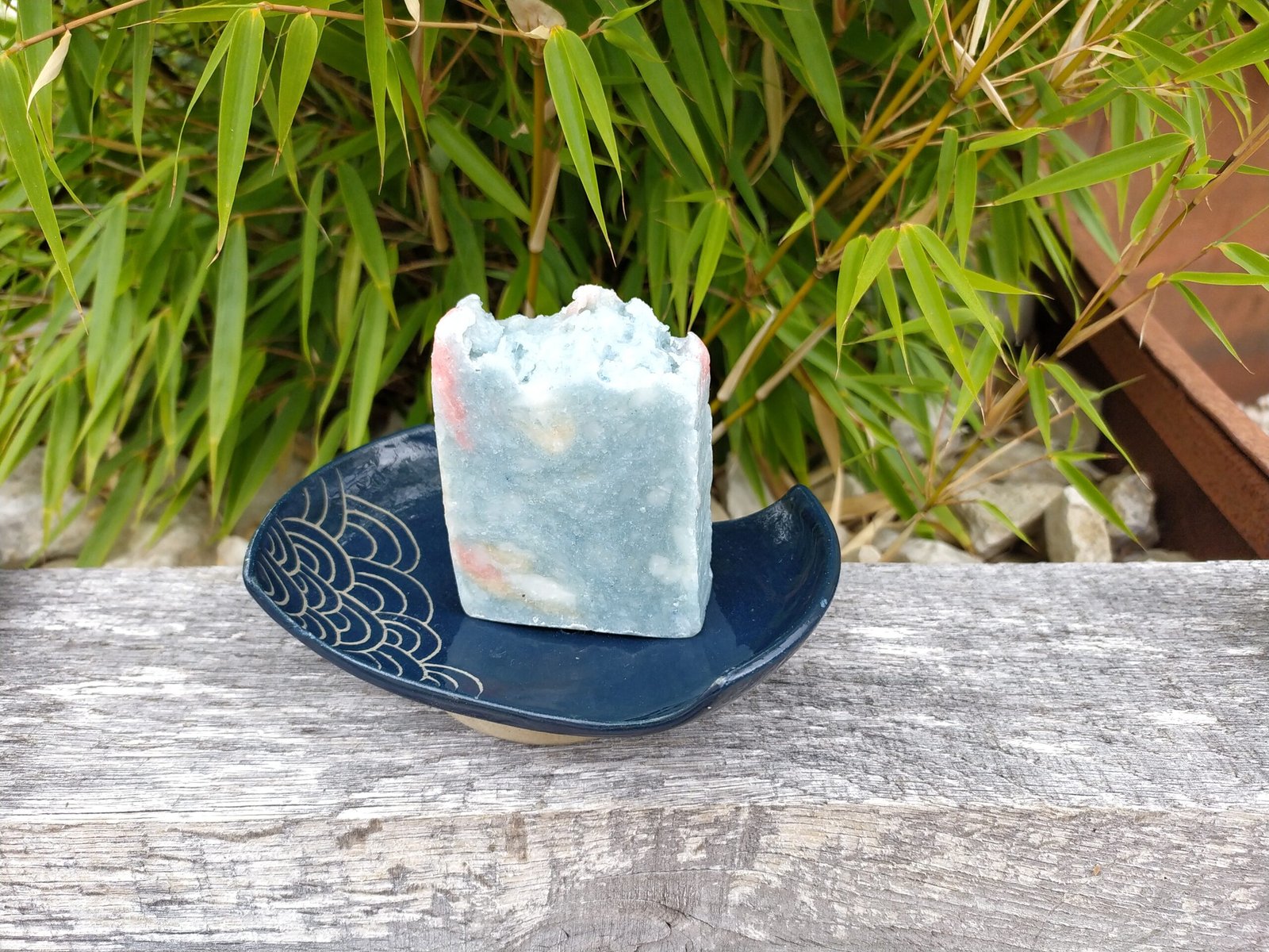 Ingrédients : *Beurre de mangue, *Huile de coco, eau, *Huile de noyaux d’abricot, *Lait d’avoine, Soude, *Huile de ricin, *Huile de jojoba, *Huile de camélia japonais, Potasse, Parfum naturel, *Curcuma, *Poudre de racine de garance, *Poudre d’indigo de persicaire et argile
